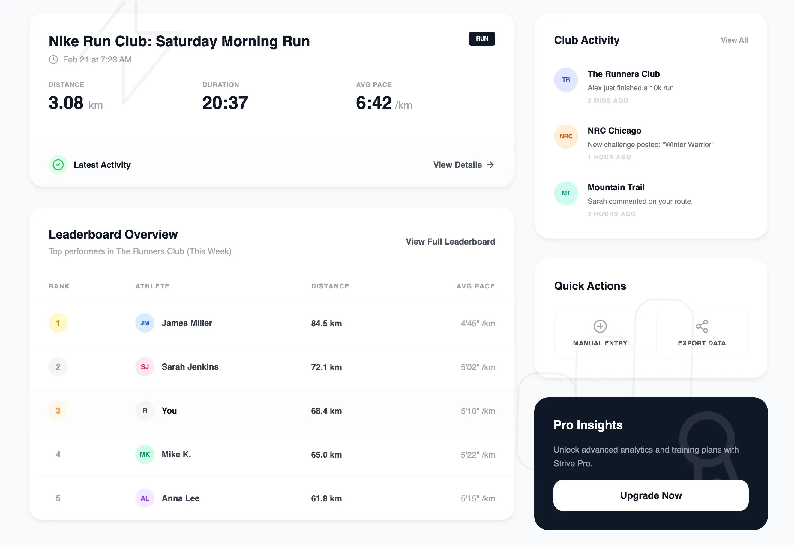 Your fitness journey, unified. Automatically sync activities from Strava and NRC to unlock global leaderboards, private clubs, and detailed analytics.
